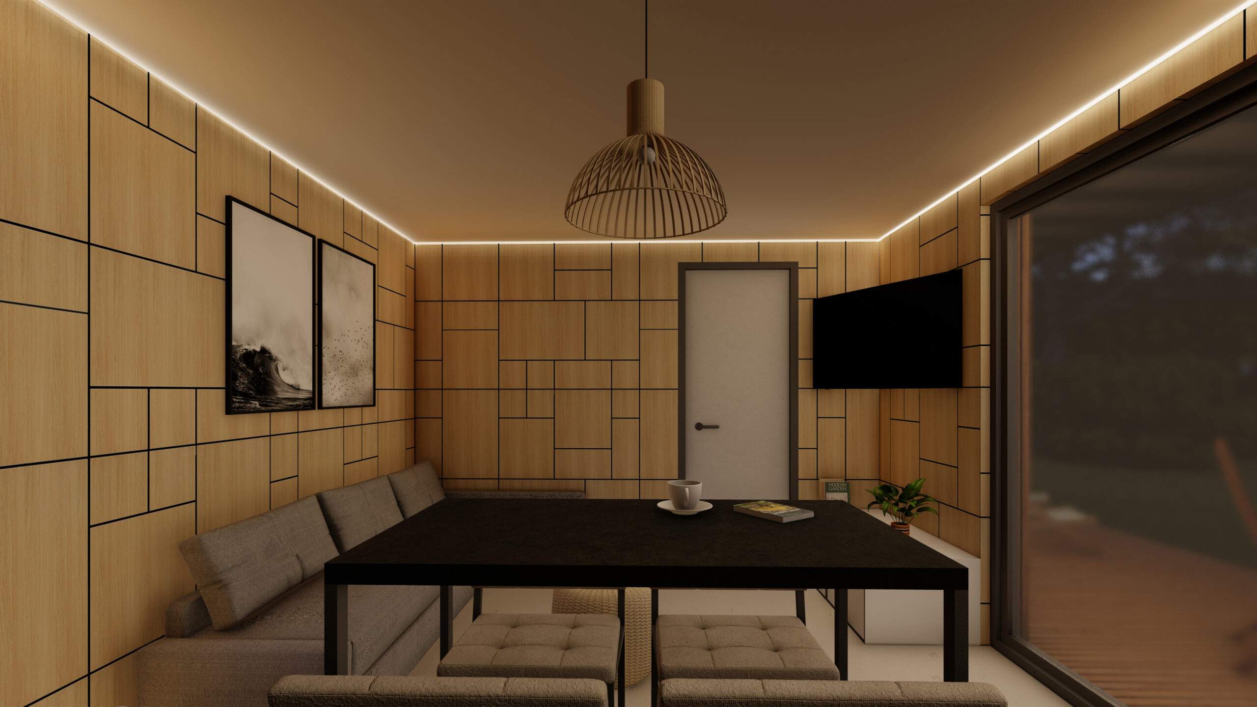 strop obložený biodoskou alebo preglejkou so zafrézovaným LED osvetlením